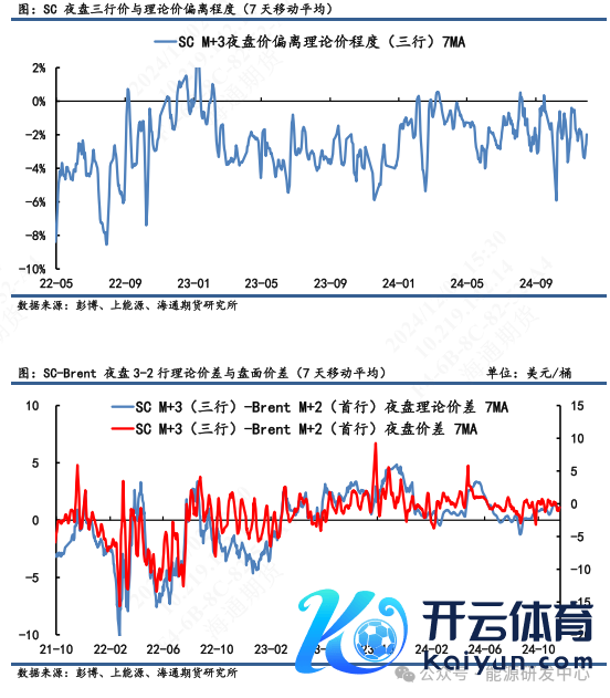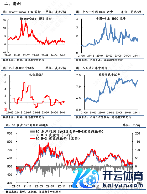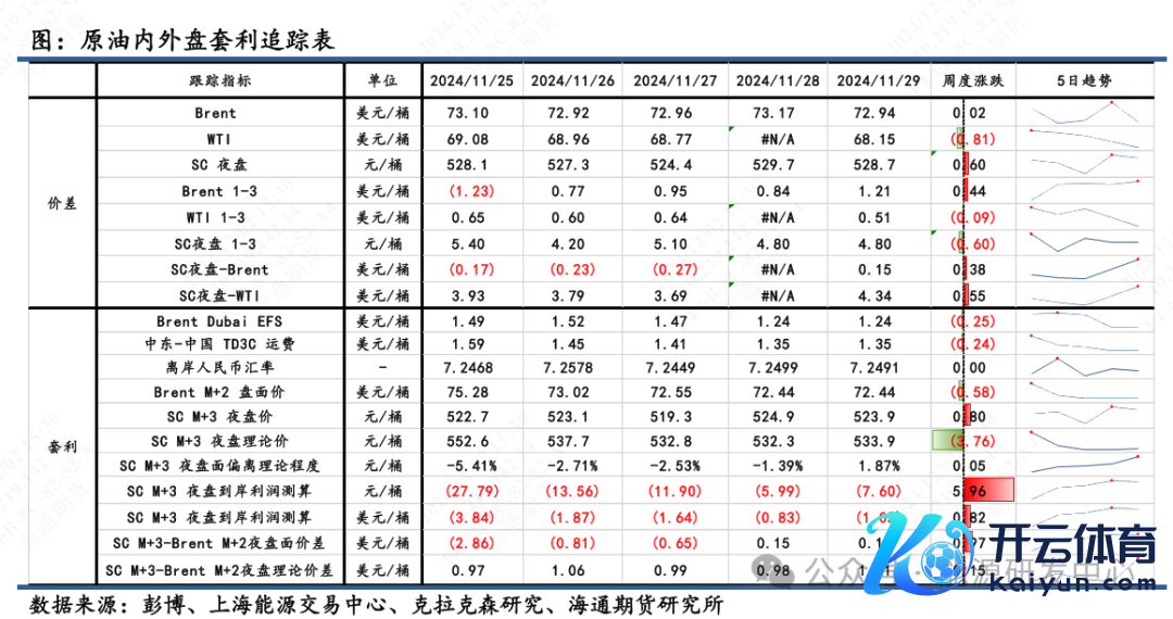 2)套利:①估值:11月29日凌晨2:30,Brent 2502盘面价为72.44好意思元/桶,SC 2503盘面价为523.9元/桶,测算SC 2503盘面理讲价为533.9元/桶,盘面估值偏离进度-1.7%。②利润:测算SC2503盘面到岸利润为-7.6元/桶,折合-1.05好意思元/桶,其到岸利润为负值。③价差:SC2503-Brent2502盘面差为0.16好意思元/桶,表面差1.21好意思元/桶,盘面价差低于理讲价差。(注:本周Brent主力合约为2502;SC主力合约为2501;M代表时下12月)。