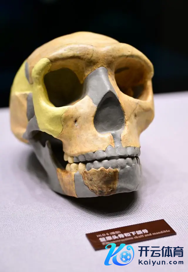 这是12月6日在位于安徽省池州市东至县的华龙洞遗迹成列馆拍摄的华龙洞6号头骨归附头骨和下颌骨(模子)。新华社记者 周牧 摄
