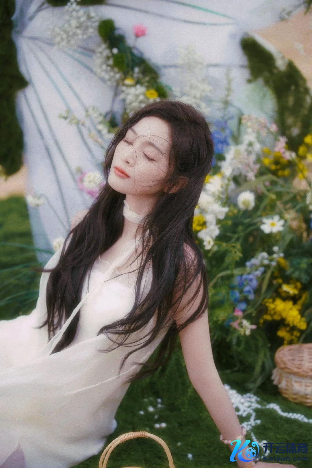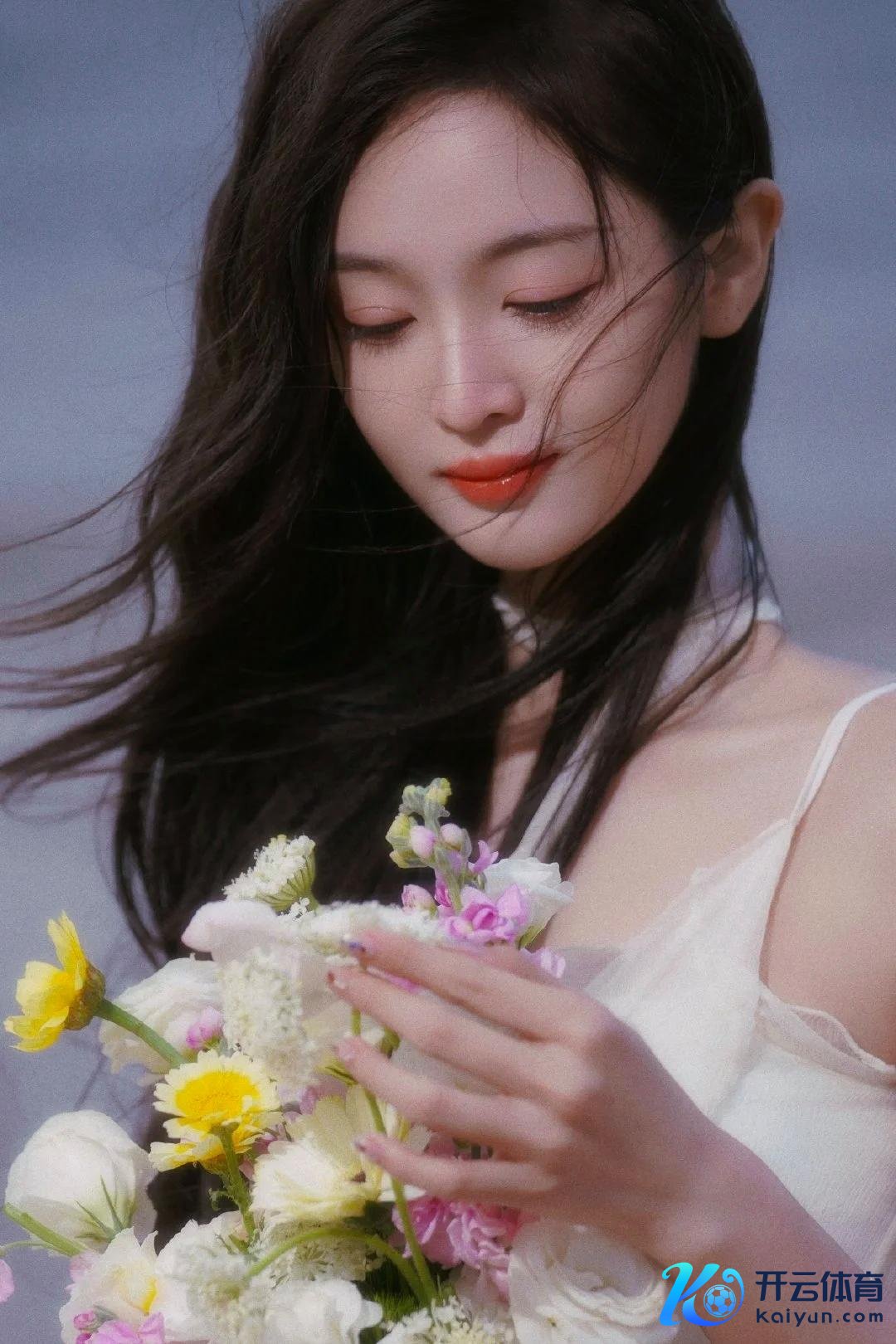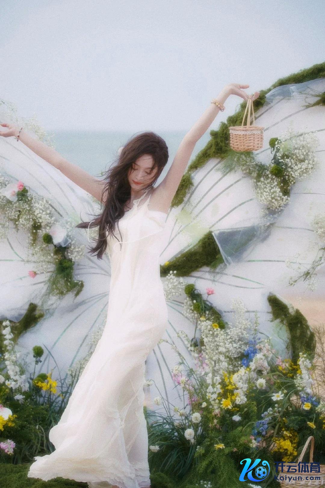 她手捧一束五彩斑斓的鲜花,花束的颜色与白色裙装酿成显现对比,增添了画面的生动与活力。花草元素的点缀不仅为全体造型注入了几分当然与荒诞的气味,也让画面更具头绪感。这一造型展现了她纯净、温婉的形象,仿佛是大当然的化身,谦让而调养。